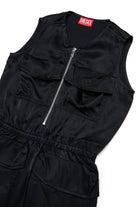 Vestido corto con logo y bolsillos aplicados. El modelo presenta un cierre frontal con cremallera, cintura elástica y tejido con acabado satinado.