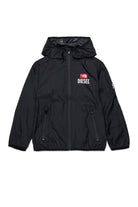 Chaqueta cortavientos con logo estampado en el pecho y detalles en contraste. El modelo presenta capucha fija y cierre frontal con cremallera.