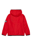 Chaqueta cortavientos con logo estampado en el pecho y detalles en contraste. El modelo presenta capucha fija y cierre frontal con cremallera.