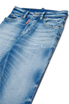 Vaqueros Boss 10 de cinco bolsillos con ajuste straight. Realizados en denim azul medio, que se distingue por los degradados y los bigotes en contraste. Rasgaduras y abrasiones en la parte delantera trasera. Etiqueta Dsquared2 aplicada en la solapa (logotipo de la bandera).