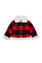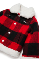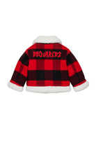 Chaqueta de piel de oveja de manga larga en suave franela a cuadros con interior de peluche. Una mezcla de comodidad y carácter, con bolsillos multiusos y un logotipo de temática de terror en la espalda.