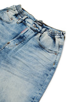 Pantalones cortos vaqueros. Realizados en denim de color claro, se distinguen por un efecto jaspeado blanqueado con degradado y bigotes en contraste. Etiqueta Dsquared2 aplicada en la solapa (logotipo de la bandera).