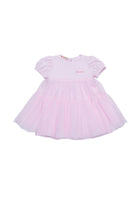 Vestido de cuello redondo con mangas globo. Lleva un logo institucional bordado en contraste de color en la parte delantera, en el lado del corazón. Parte inferior de tul con enaguas de algodón. Cierre de cremallera en la parte trasera. Perfecto para ceremonias y ocasiones especiales.