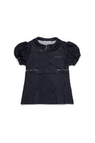 Camisa de denim con logo en el pecho y detalles de costuras en contraste. El modelo presenta mangas cortas con plumas y cuello redondeado para un look refinado y contemporáneo.
