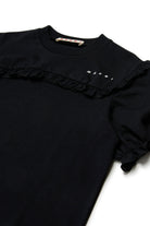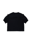 Camiseta de manga corta de suave jersey de algodón adornada con volantes en la parte delantera y las sisas. El logo institucional bordado en color de contraste en el lado del corazón añade un toque refinado a una prenda perfecta para diversas ocasiones.