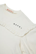 Camiseta de manga corta de suave jersey de algodón adornada con volantes en la parte delantera y las sisas. El logo institucional bordado en color de contraste en el lado del corazón añade un toque refinado a una prenda perfecta para diversas ocasiones.