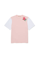 Camiseta de 100% algodón con una rosa bordada y el logo en el pecho.