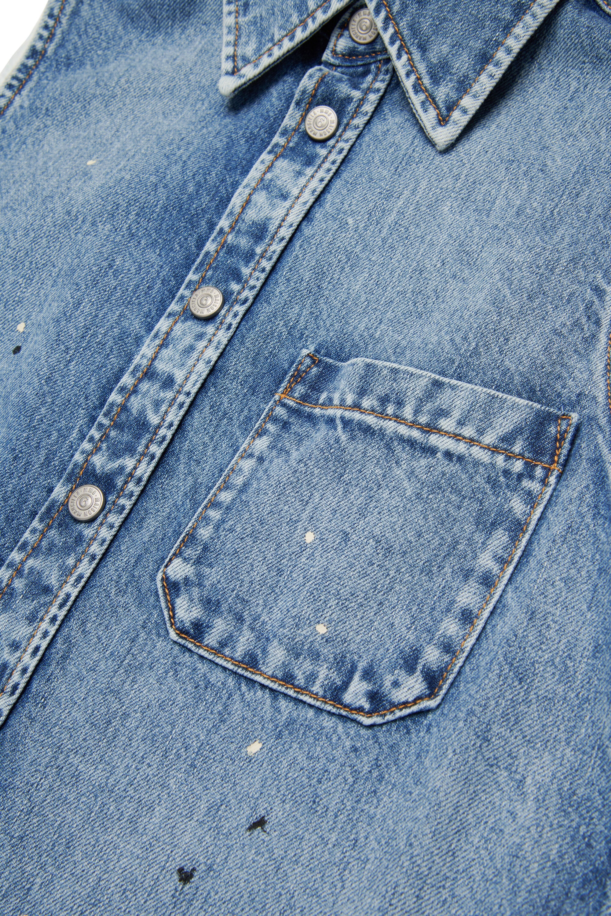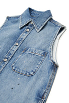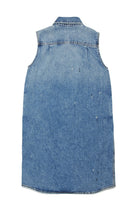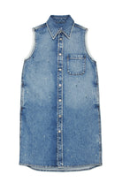 Vestido maxi camisa sin mangas. Realizado en denim azul con gradientes de color en contraste. Caracterizado por el tratamiento "manchas de color" realizado a mano. Bolsillo delantero en el lado del corazón. Bolsillos con ribete laterales. Cierre de botón frontal. Costura icónica en la espalda. Realizado en 100% algodón. Cualquier diferencia entre la prenda fotografiada y la que recibirá es un símbolo de la fina confección, la calidad y la singularidad del producto.