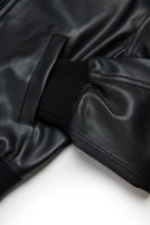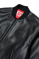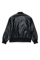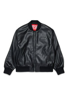 Veste biker en tissu enduit avec logo imprimé sur la poitrine, caractérisée par des finitions côtelées et des poches latérales.