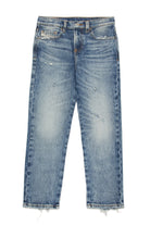 Jeansà cinq poches avec une coupe straight fit et une attitude intemporelle. Taille moyenne. Fabriqué en denim dans une nuance hybride de bleu et de gris. Se distingue par des dégradés, des moustaches et des coutures de couleur contrastée. Raccommodage des abrasions et des ourlets effilochés sur les poches avant et l'ourlet. Comporte un logo "D" brodé de couleur contrastante sur la poche arrière. Le modèle est doté d'une taille réglable et d'une fermeture élastique.