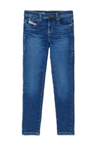 Jean skinny fit en denim bleu avec surpiqûres contrastantes.