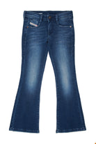 Jean bootcut en denim bleu moyen avec légères abrasions et surpiqûres contrastantes. Un classique cinq poches au caractère contemporain.