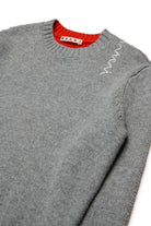 Pull à manches longues et col ras du cou en laine mélangée, avec un design colorblock original et une construction contrastée : maille rasée sur le devant et maille côtelée dans le dos. Le logo Marni Handmade brodé à la main sur l'épaule ajoute un détail artisanal, renforçant le caractère unique et la qualité du vêtement.