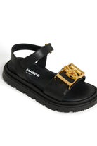 Sandales avec application métallique dorée sur la bride. Un modèle au style affirmé avec une semelle épaisse et une tige structurée.