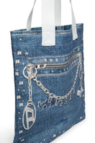 Sac cabas Wrisy avec logo et imprimé effet denim, orné de clous et de détails chaîne à l’avant. Le design se distingue par des doubles anses en tissu et une doublure intérieure unie.