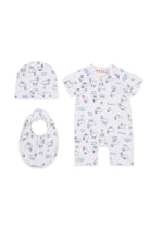 Ensemble pour nouveau-né en coton avec logo et imprimé moutons allover, composé d’un body, d’un bavoir et d’un bonnet.
