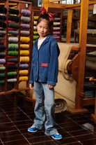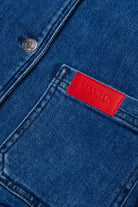 Blazer en denim avec logo appliqué sur la poche. La pièce se caractérise par des surpiqûres contrastées et de grandes poches avant.