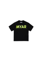 T-shirt en coton confectionné avec du tissu invendu, avec logo MYAR imprimé sur la poitrine.