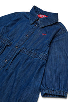 Robe courte à manches longues en denim bleu moyen. Le tissu léger assure confort et liberté de mouvement, tandis que le cordon de serrage à la taille permet d'ajuster la coupe.