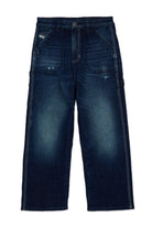 Jeans relaxed fit en denim bleu foncé avec abrasions avec une attitude utilitaire/travail. Une silhouette oversize décontractée de la taille aux chevilles, douce sur la jambe. Un jeans parfait pour ceux qui aiment le confort avec l'ADN inimitable de DIESEL.