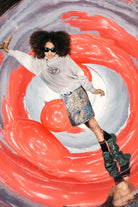 Jupe courte moulante en tissu stretch brillant. L'impression numérique Acid Rain allover, rehaussée par l'application de clous transparents et scintillants, donne un effet de goutte d'eau brillant et unique.