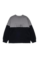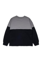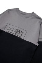 Sweat-shirt bicolore à col ras du cou et à manches longues, doté d'une construction A-cut typique de MM6. Le design simule l'assemblage de deux vêtements déconstruits et réassemblés, ce qui donne un look audacieux et contemporain, souligné par le bas coupé à vif.