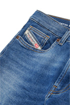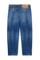 JoggJeans® à cinq poches avec une fit straight et une attitude de rue. Taille moyenne. Fabriqué en denim bleu moyen à poignée souple, distingué par des dégradés, des moustaches et des coutures de couleur contrastée. Les coutures en zig-zag s'interrompent sur le devant. Le modèle est doté d'une ceinture réglable et d'une fermeture élastique.