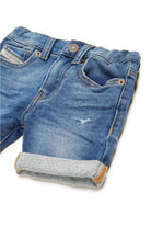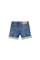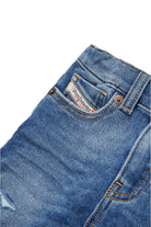 Pantalon court JoggJeans®. Fabriqué en denim bleu moyen à poignée souple, caractérisé par des dégradés, des moustaches et des coutures de couleur contrastée. Ruptures de raccommodage avec zig-zag sur le devant. Bas du pantalon avec enroulement.