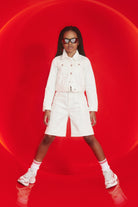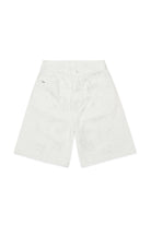 Short en denim avec applications de strass et motif perforé formant le logo. Un modèle au style distinctif, parfait pour des looks décontractés.