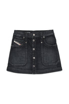Jupe en denim mini avec logo et surpiqûres contrastées. Le modèle présente des poches plaquées à l'avant et à l'arrière et une fermeture frontale à boutons.