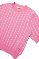 Haut à manches courtes et à col ras en tricot à rayures verticales. Logo institutionnel brodé sur le bas en couleur contrastante. Construction côtelée sur le col ras du cou, les poignets et l'ourlet. Fabriqué en 100 % coton.