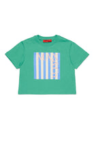 T-shirt en 100% coton avec logo frontal et motif à rayures verticales. Un vêtement frais à la coupe régulière.