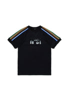 T-shirt in morbido jersey di cotone con bande multicolor lungo le maniche. Il contrasto tra la stampa lucida del logo e i dettagli sportivi rende il capo perfetto per i look quotidiani.