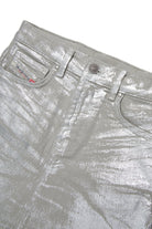 Gonna mini con logo e finitura laminata effetto used. Modello a cinque tasche con fondo sfrangiato.
