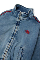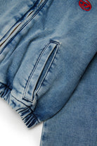 Giacca denim con logo e dettagli a contrasto sulle maniche per uno stile sportivo e contemporaneo.