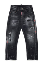 Jeans regular con lavaggio nero effetto used, caratterizzati da rotture e dettagli con cuciture a contrasto.