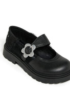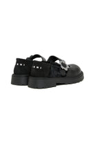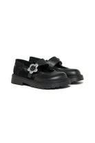 Scarpe Mary Jane con fibbia a forma di fiore e logo sul tallone, realizzate in un raffinato mix di pelle martellata, scamosciata e cavallino. Un design elegante e originale per una calzatura comoda e versatile.