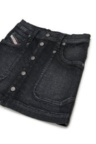 Gonna mini in denim con logo e cuciture a contrasto. Il modello presenta tasche applicate sul fronte e retro e chiusura frontale con bottoni.