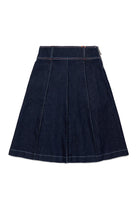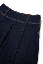 Gonna midi in denim scuro con maxi pieghe che donano movimento e volume. Un capo facile da abbinare, perfetto per look casual ma curati.