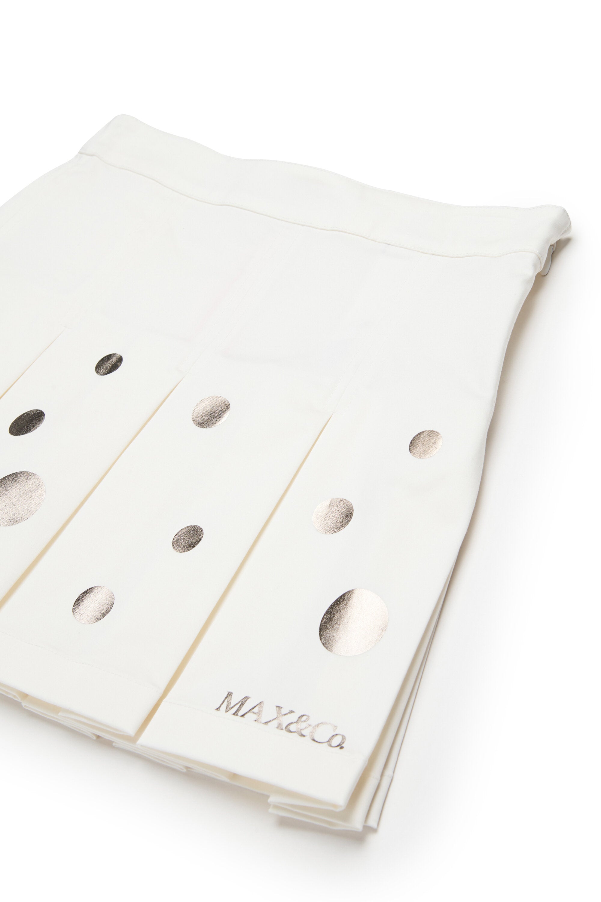 Gonna mini con logo e stampa a pois metallizzati. Modello plissettato dal design dinamico, ideale per completare look giocosi.