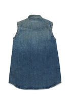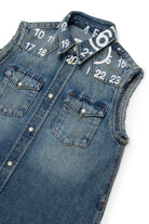 Abito corto in denim con logo stampato. Il capo è caratterizzato da una silhouette senza maniche, tasche applicate sul petto e iconica cucitura sul retro.