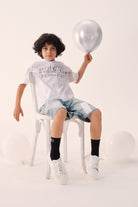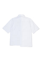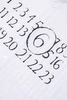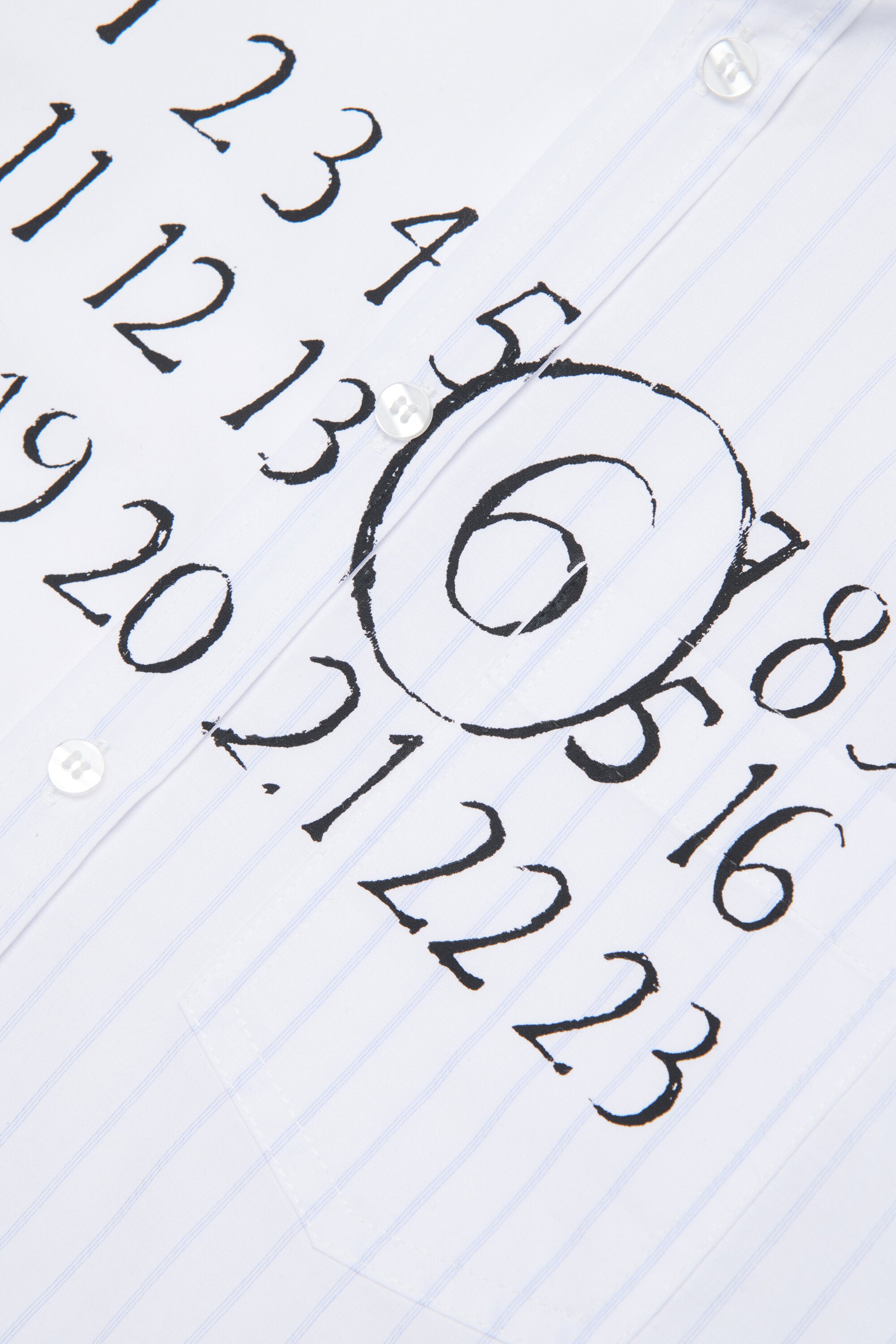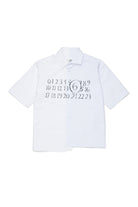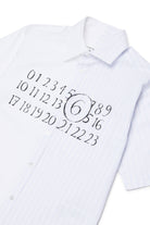 Camicia a maniche corte con logo stampato e motivo numerico frontale. Il modello presenta un design bicolor con metà a righe sottili e metà tinta unita.