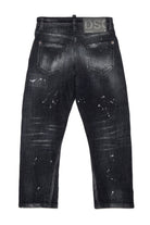 Jeans regular con lavaggio nero effetto used, caratterizzati da rotture e dettagli con cuciture a contrasto.