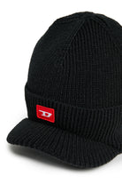 Berretto beanie in maglia misto lana caldo e morbido. La visiera aggiunge un tocco di personalità e praticità, mentre la patch D rossa applicata sul davanti aggiunge distintività.