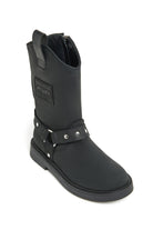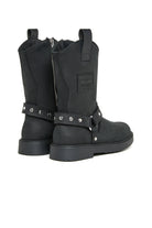Stivali biker in pelle con cinturino borchiato. L’etichetta laterale stampata completa il look, rendendoli perfetti per chi cerca un paio di stivali in stile rock.