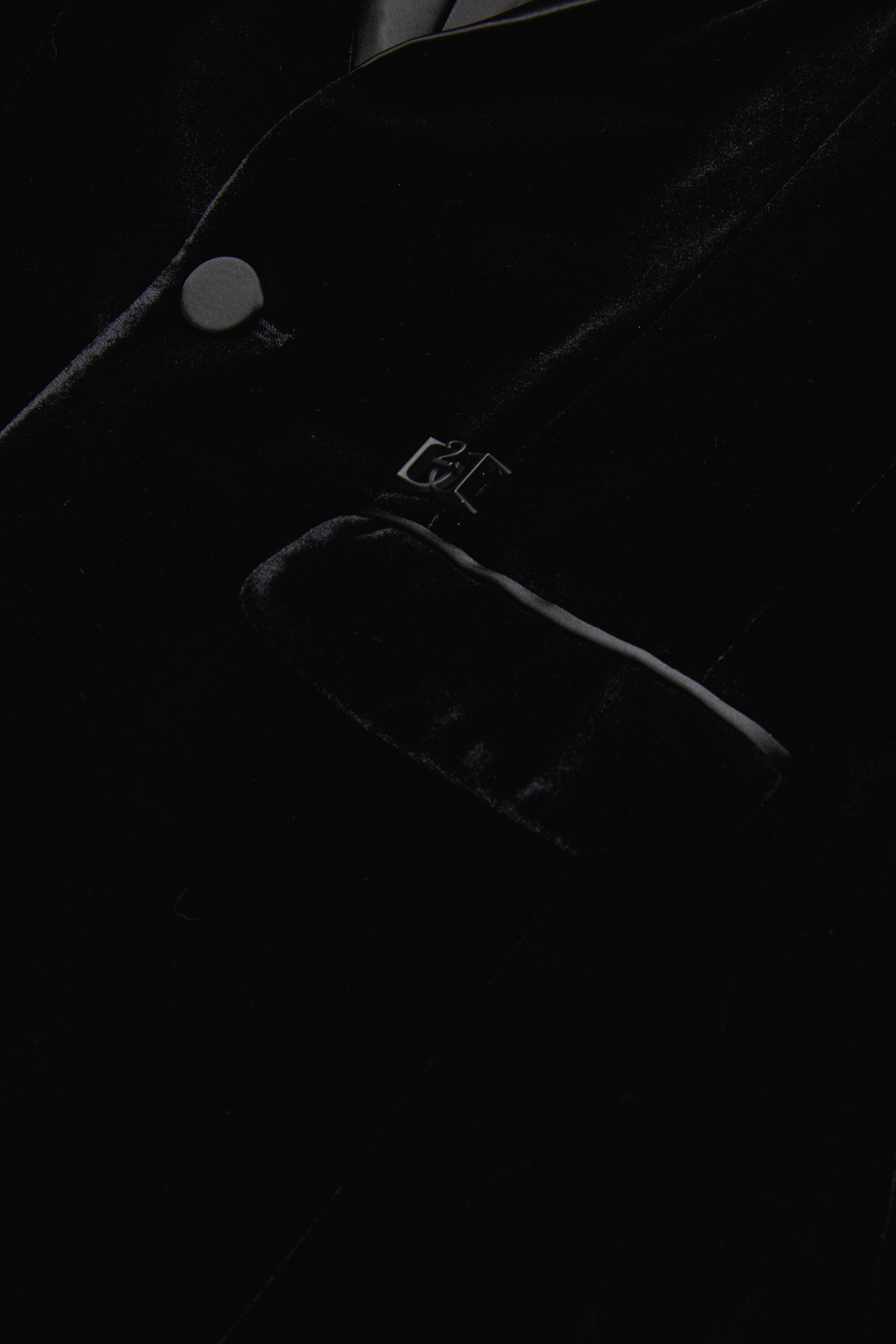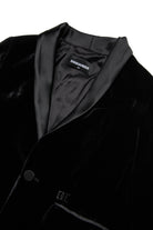 Giacca blazer in velluto con placca metallica D2 nera opaca applicata. Un modello dal taglio elegante con dettagli raffinati che reinterpretano il classico blazer in chiave moderna. Perfetto per eventi formali e occasioni speciali.