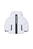 Giacca imbottita trapuntata lunga in nylon lucido con cappuccio. Il logo Dsquared2 a contrasto lungo la chiusura dona un tocco iconico e immediatamente riconoscibile.