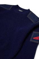 Pullover girocollo in misto lana lavorata a coste con inserti in denim. Sulla manica spicca una patch con logo Icon New Generation ricamato a contrasto colore. Perfetto per creare casual look originali.