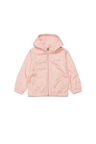 Giacca a vento con logo stampato, cappuccio fisso e linea essenziale.