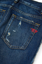 - Lavaggio con sfumature a contrasto, abrasioni sui fianchi e sul fondo. Logo "D" ricamato sul retro